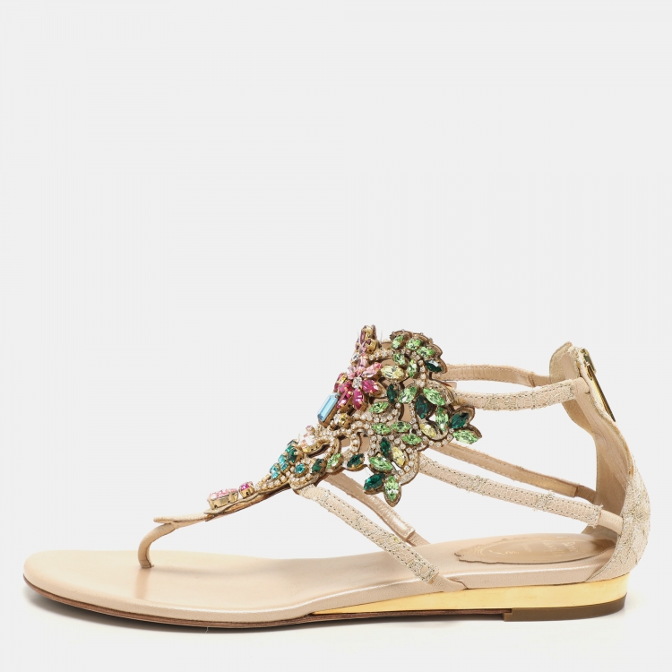 Pre Owned صندل رينيه كوفيللا دانتيل ومتعدد الألوان ومزخرف كريستال مسطح بيج مقاس 37