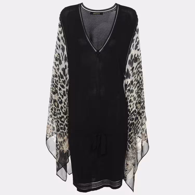 Pre Owned فستان روبيرتو كافالي من حرير بطبعة حيوانات وجيرسي أسود كبير
