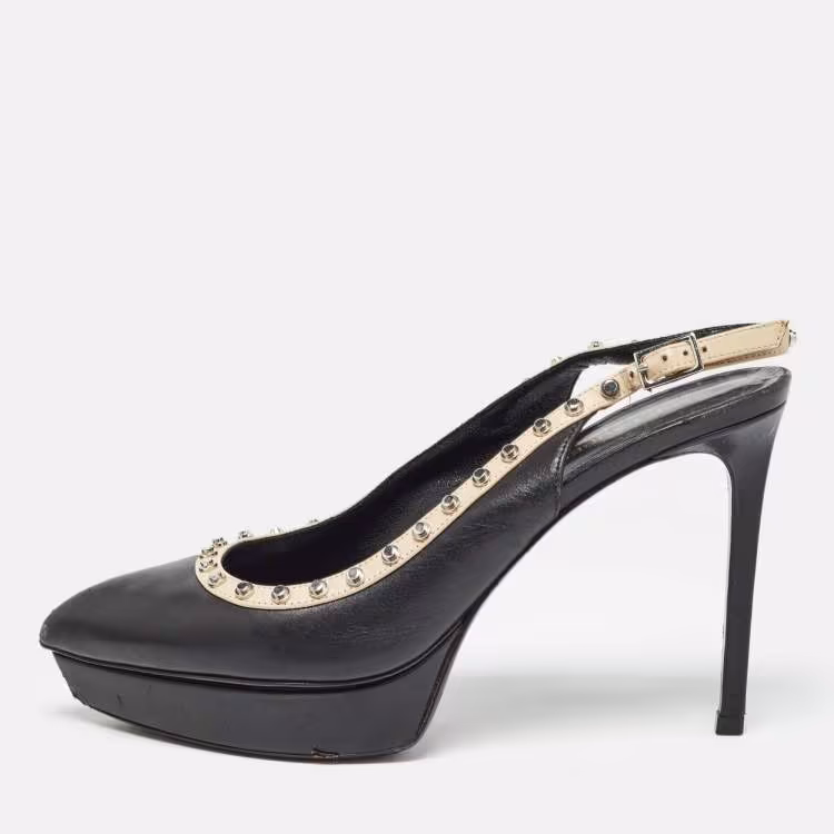 مملوكة مسبقًا حذاء كعب عالي سان لوران باريس بلاتفورم مرصّع جلد أسود بمقدمة مدببة حزام خلفي مقاس 38.5
