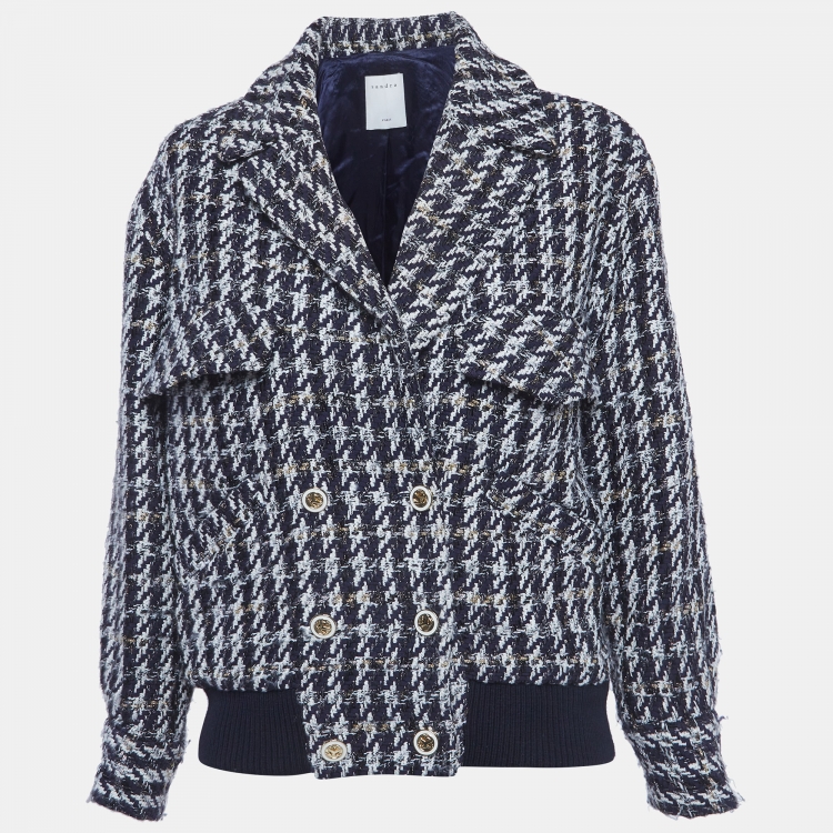 جاكيت ساندرو أزرق/أبيض بنقشة هوندستوث بصدر مزدوج مقاس صغير