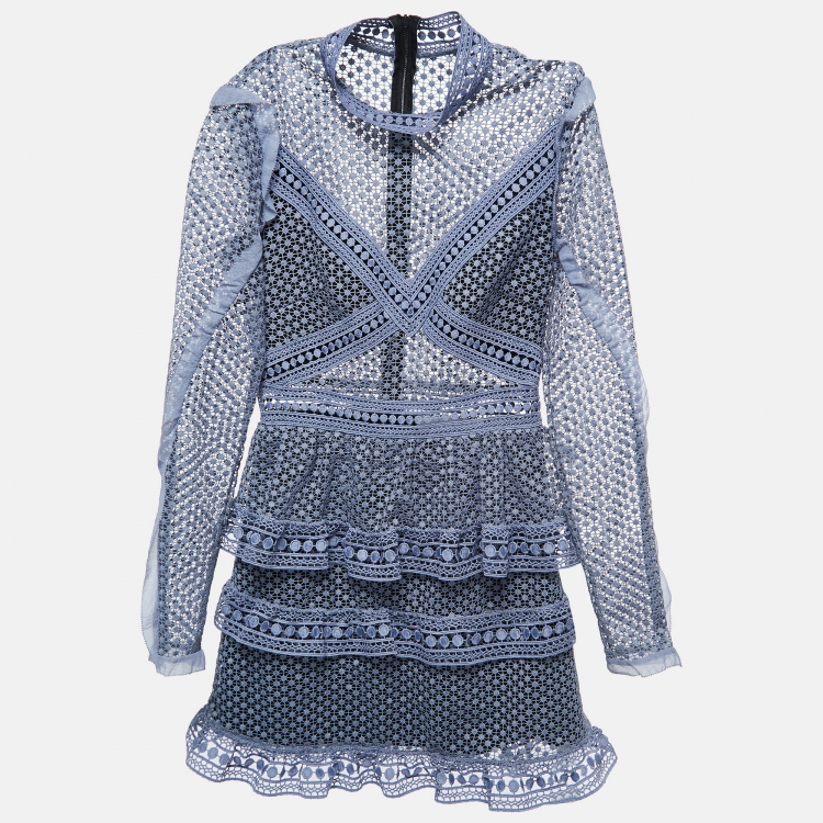مملوكة مسبقًا Self-Portrait Blue Guipure Lace Tiered Mini Dress S