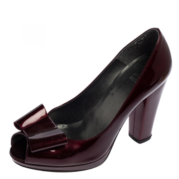 مملوكة مسبقًا حذاء كعب عالي ستيوارت وايتزمان جلد لامع عنابي مقدمة مفتوحة مزين فيونكة مقاس 38