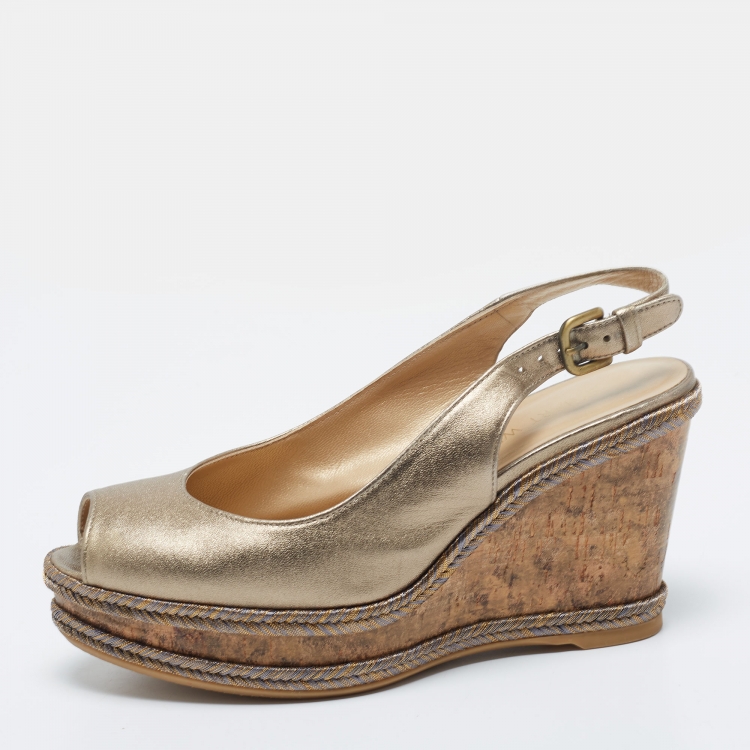 مملوكة مسبقًا صندل ستيوارت وايتزمان جين جلد ذهبي ميتاليك مقدمة مفتوحة كعب فينيل روكي بحزام خلفي للكاحل مقاس 36.5