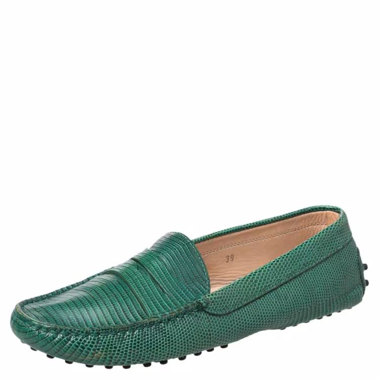 حذاء لوفرز تودز جلد نقشة السحلية أخضر سير بيني سليب أون مقاس 39