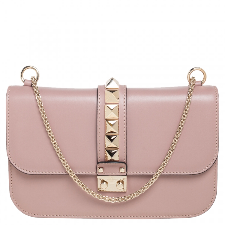 حقيبة فالنتينو جلد بيج مرصع روكستد قفل غلام ذات قلاب متوسطة
