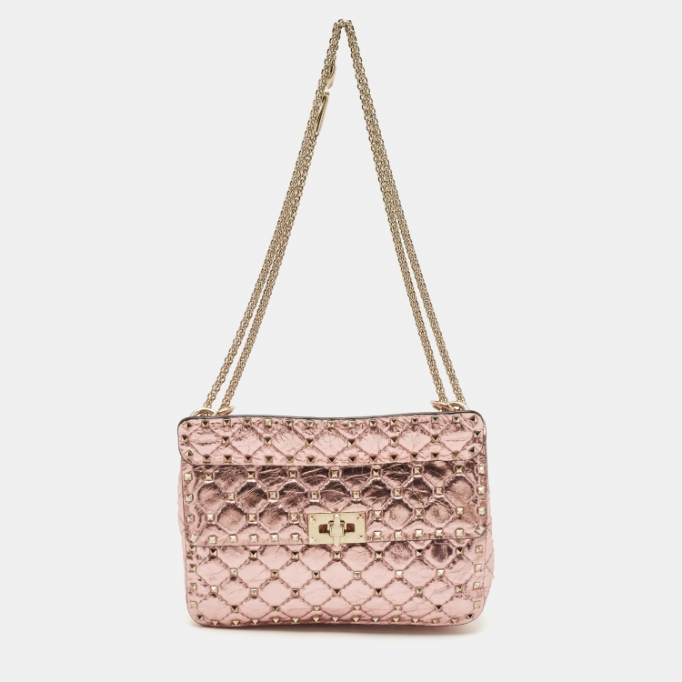 Valentino Metallic Pink Quilted Leather Medium Rockstud Spike Top Handle Bag