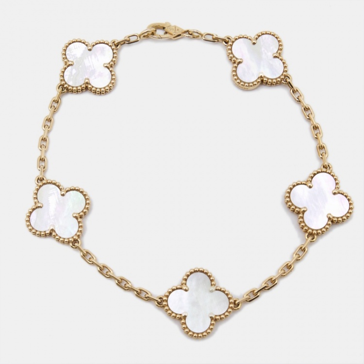 Pre Owned Van Cleef & Arpels Vintage Alhambra Mother of Pearl 18k Yellow Gold 5 Motif Station Bracelet