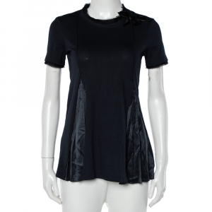 تي شيرت برادا قطن ساتان وتريكو أزرق كحلي بقصات بفيونكة مقاس صغير جدًا - إكس سمول