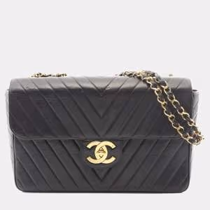 حقيبة شانيل سوداء ضخمة كبيرة كلاسيكية من جلد الحمل بغطاء واحد