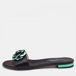 صندل سلايد شانيل كانفاس أسود مزين كاميليا وشعار الماركة سي سي مقاس 39