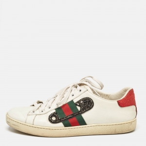 حذاء رياضي غوتشي نيو أيس حواف جلد ثعبان مزين ويب مزخرف لؤلؤ صناعي منخفض من أعلى جلد أبيض مقاس 38