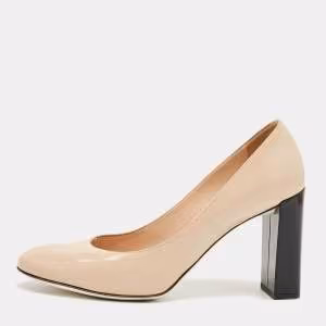 حذاء فنْدي ساتان بني وبيج مخمل كوليبري بكعب سميك وحزام خلفي مقاس 36