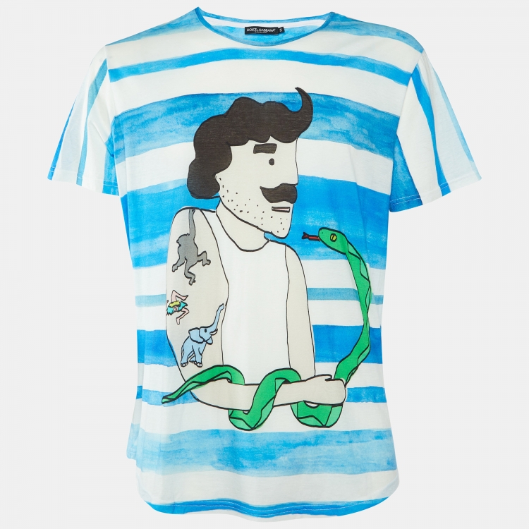 Dolce & Gabbana Blue/White Striped Graphic Print Cotton Crew Neck T-Shirt XXL