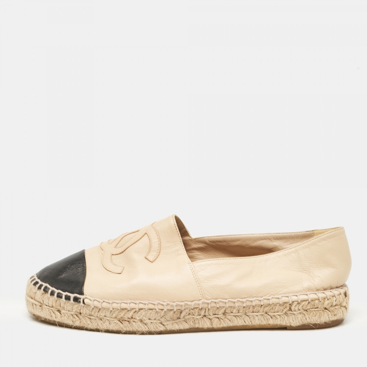 Chanel Beige/Black Leather CC Cap Toe Espadrille Flats Size 39