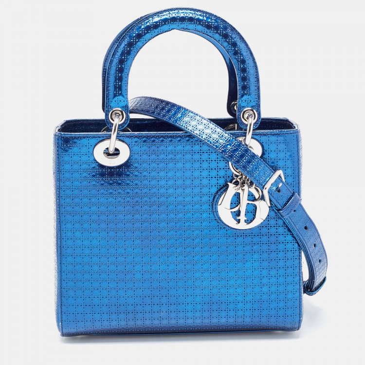 Dior Metallic Blue Microcannage Patent Leather Medium Lady Dior Tote