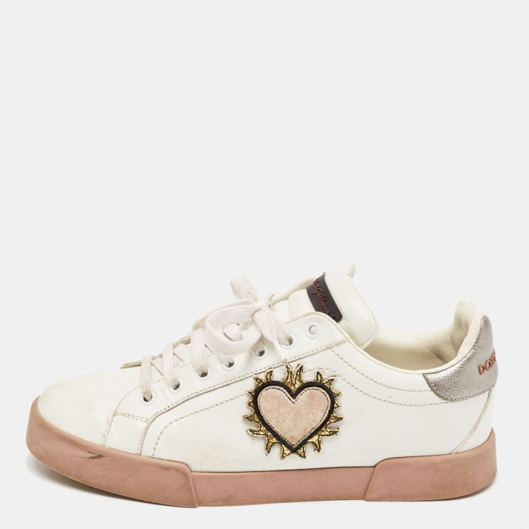 Pre Owned Dolce & Gabbana White Leather Love Applique Portofino Low Top Sneakers Size 40