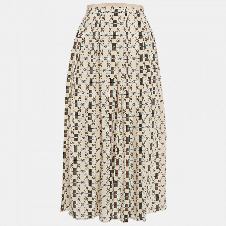Gucci Beige Web Kisses & Logo Monogram Print Silk Pleated Midi Skirt S