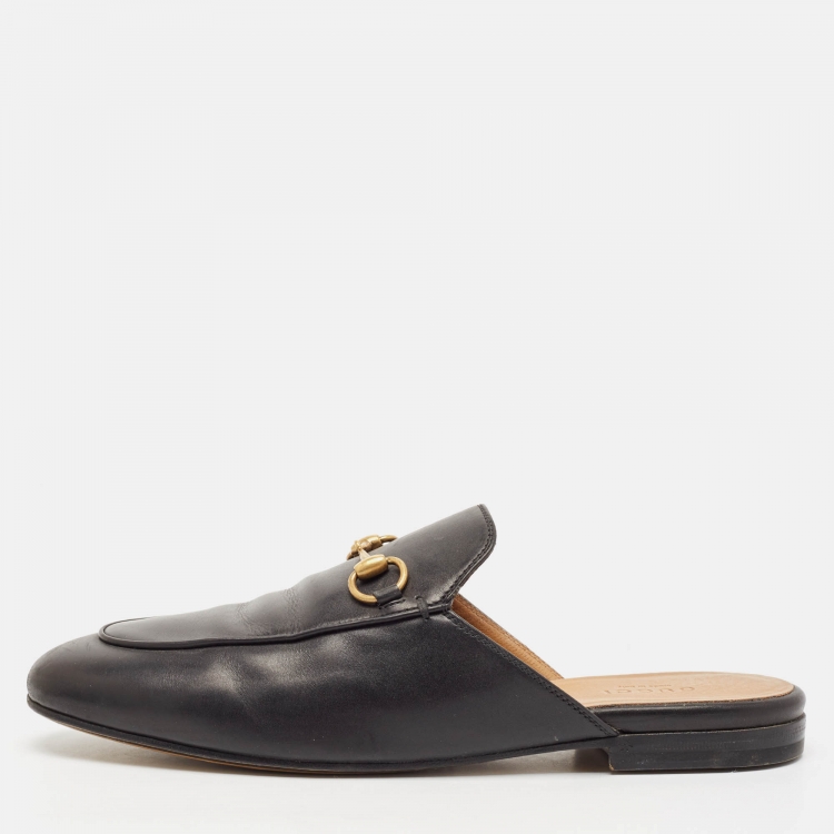 Gucci Black Leather Princetown Horsebit Flat Mules Size 38