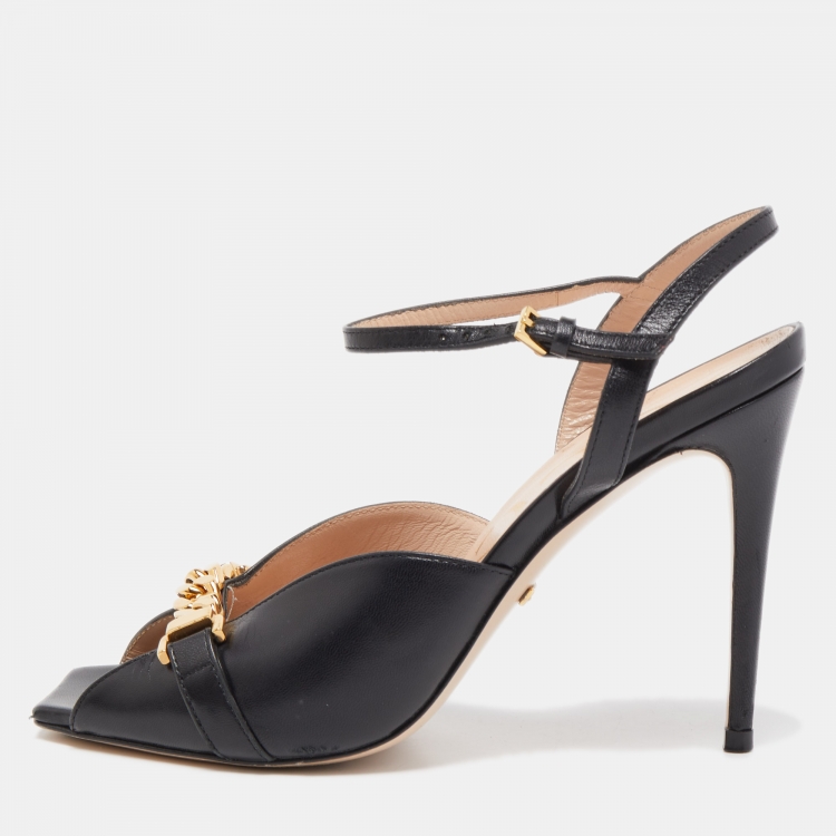 Pre Owned Gucci Black Leather Sylvie Chain Ankle Strap Sandals Size 36