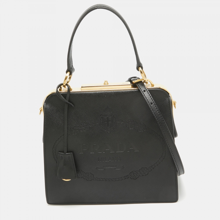 Prada Black Logo Print Saffiano Leather Frame Top Handle Bag