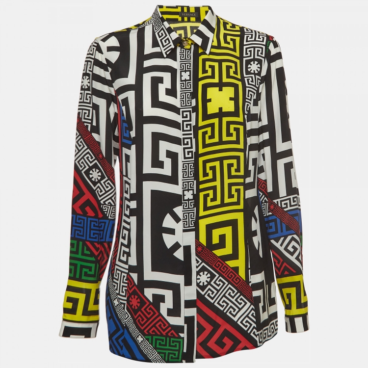 Versace Multicolor Geometric Greek Print Chiffon Silk Shirt L