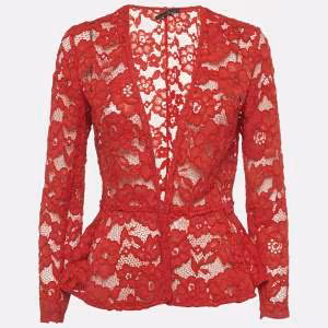 CH Carolina Herrera Red Embossed Jacquard Peplum Style Jacket M