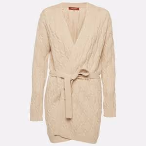 Max Mara Studio Beige Cable Knit Belted Cardigan L
