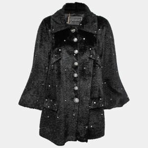 Versus Versace Vintage Black Rhinestone-Embellished Faux Fur Coat S