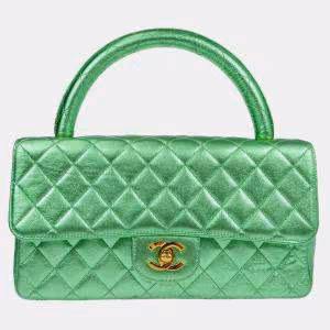 Chanel Metallic Green Lambskin Leather Quilted Top Handle Bag