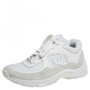 Chanel White/Grey Suede, Leather And Fabric CC Low-Top Sneakers Size 38.5
