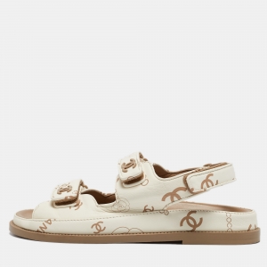 Chanel Beige CC Turnlock Leather Triple Strap Flat Sandals Size 40.5