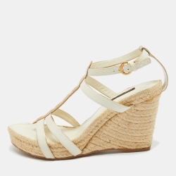 Louis Vuitton White/Brown Canvas and Patent Leather Espadrille Wedge Sandals Size 36.5