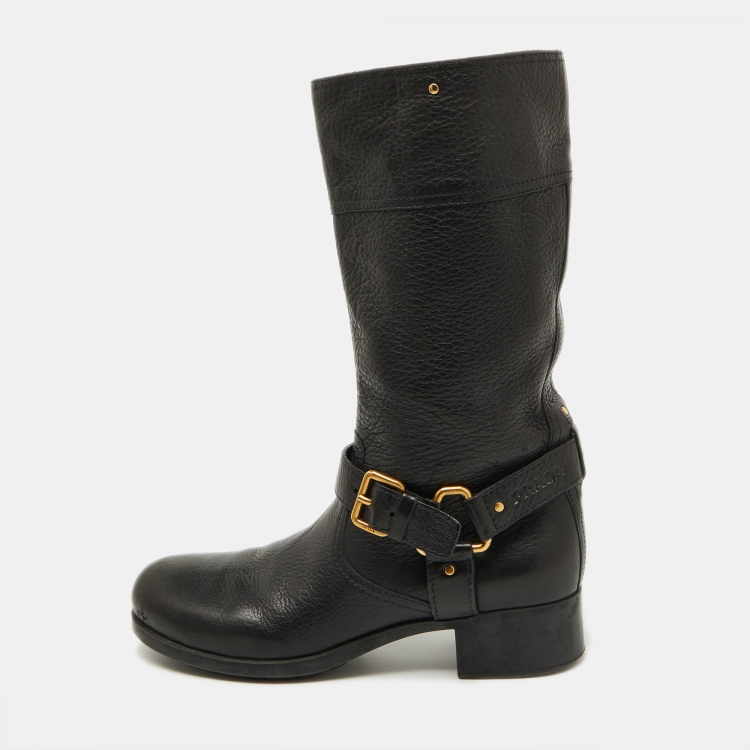 Prada Sport Black Leather Buckle Detail Mid Calf Length Boots Size 39