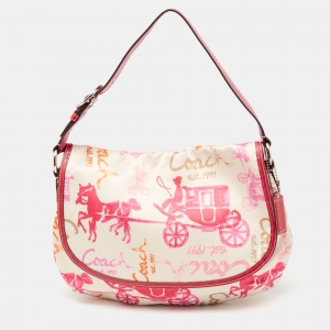حقيبة هوبو كوتش جلد لامع وقماش نقشة عربة نقل كريمي / وردية بقلاب