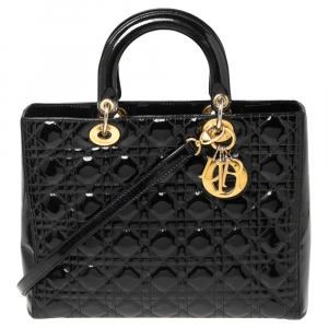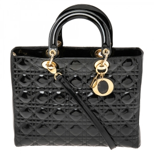 Pre Owned حقيبة يد توتس ديور ليدي ديور جلد كاناج أسود لامع كبيرة
