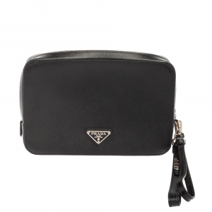 حقيبة كلتش برادا جلد سافيانو أسود بسحاب مستديرة