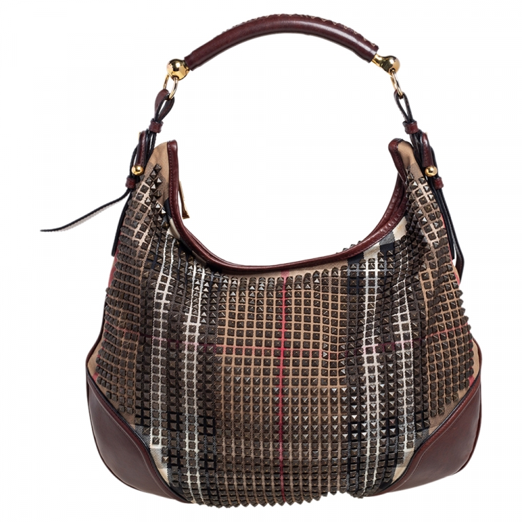 Burberry Brown Housecheck Canvas Leather Studded Hoxton Hobo