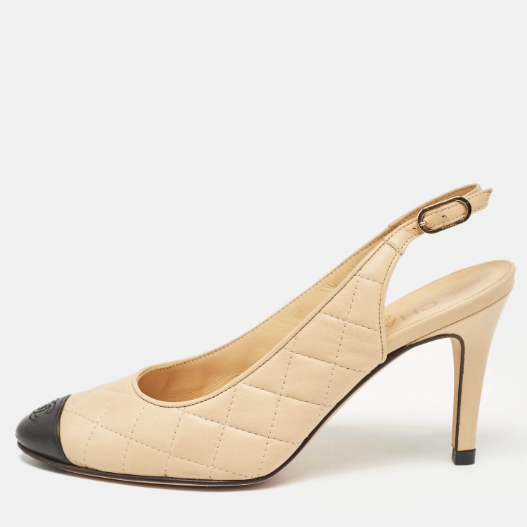 Chanel Beige/Black Quilted Leather CC Cap Toe Slingback Pumps Size 38.5