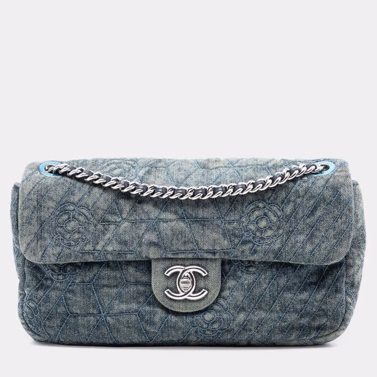 مملوكة مسبقًا حقيبة شانيل كامليا قلاب دينيم مطرز أزرق بحجم متوسط