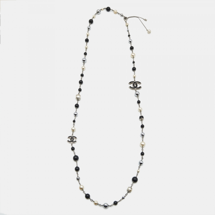 Pre Owned قلادة شانيل لؤلؤ صناعي خرز مينا فضية اللون