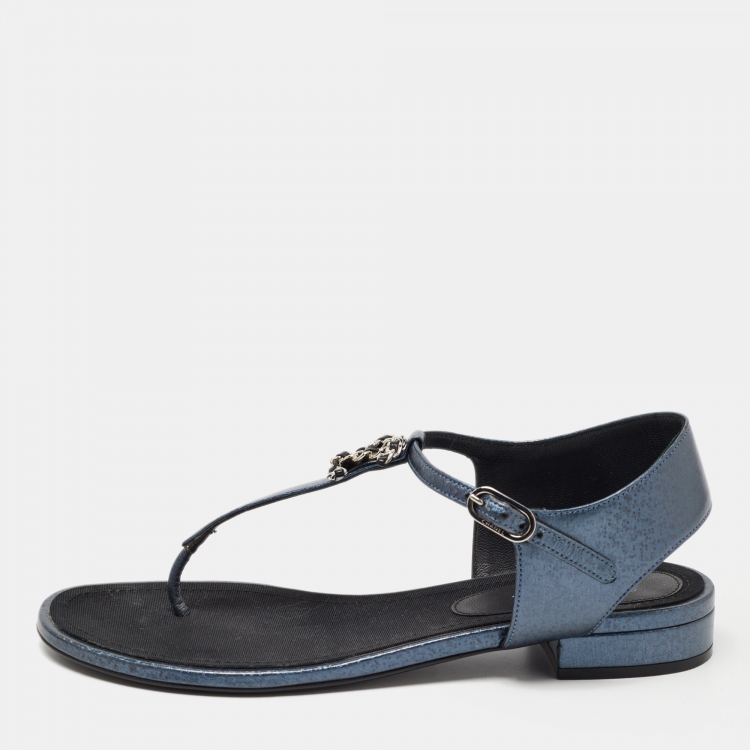 Chanel Dark Blue Leather CC Flat Thong Sandals Size 38