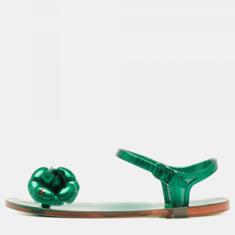 Chanel Green Glitter Jelly Camellia Flat Sandals Size 37