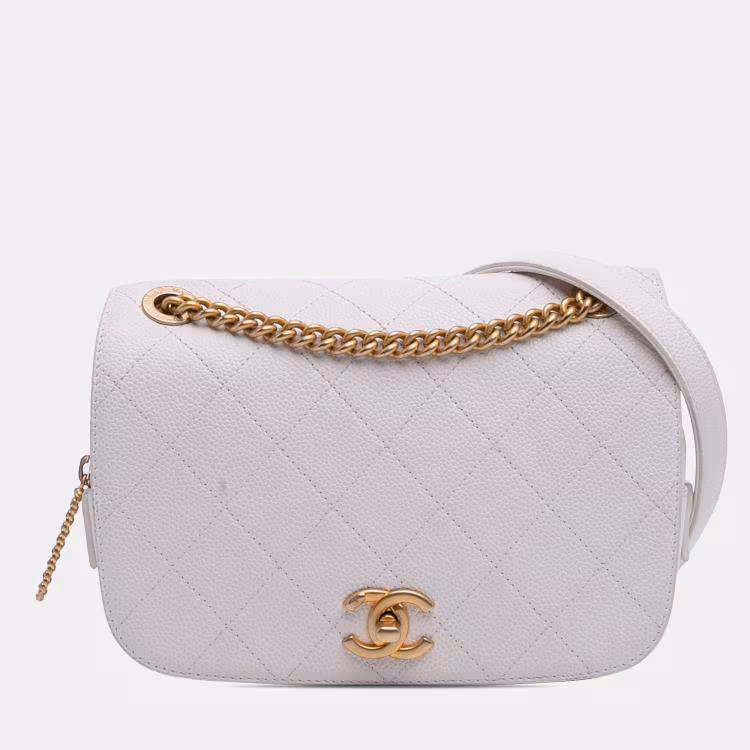 حقيبة شانيل قلاب ذات قفل أبيض مبطنة بشعار CC كافيار