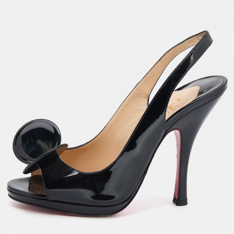 صندل كريستيان لوبوتان مادام ماوس جلد أسود لامع مقدمة مفتوحة بحزام خلفي للكاحل مقاس 37.5