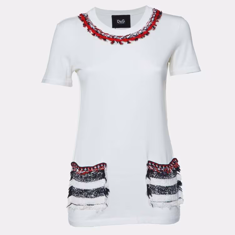 Pre Owned تيشيرت دولتشي أند غابانا أبيض قطن مزين بتويد مقاس صغير