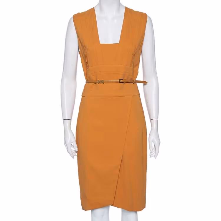 مملوكة مسبقًا فستان إيلي صعب بلا أكمام حزام طية كريب بني بيج مقا�س صغير