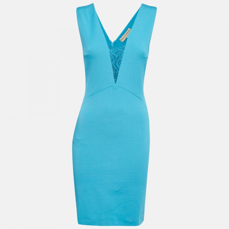 مملوكة مسبقًا Emilio Pucci Blue Jersey V-Neck Lace Trimmed Mini Dress M