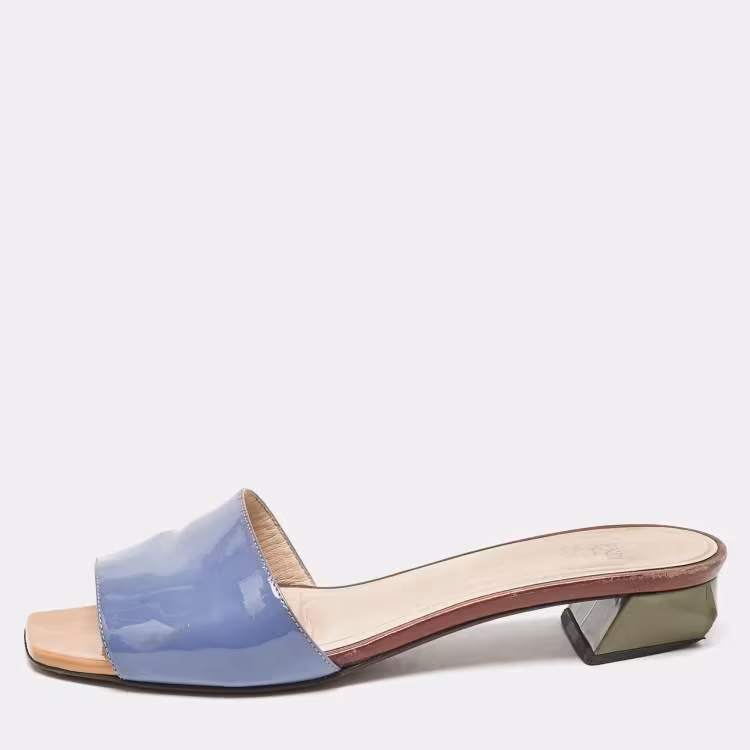 صندل سلايد فندي جلد لامع أزرق مفتوح الأصابع مقاس 38