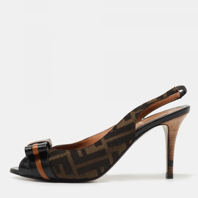 Fendi Brown/Black Zucca Canvas and Leather Bow Peep Toe Slingback Pumps Size 38