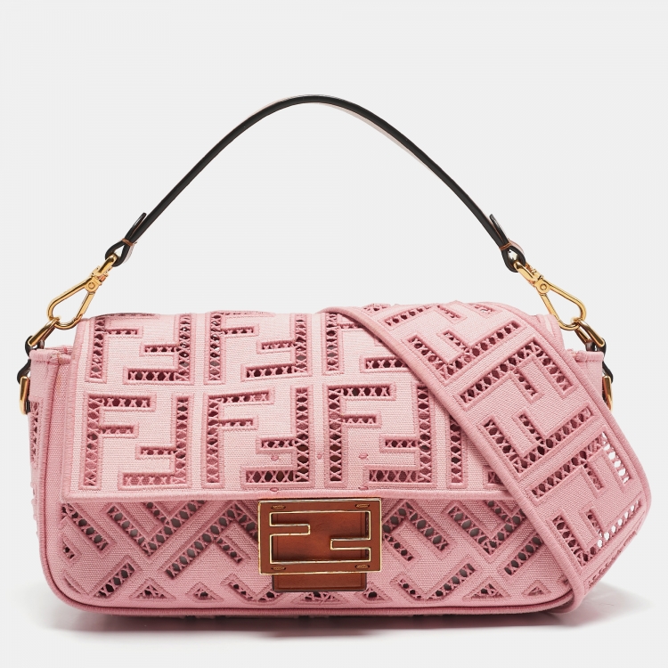 Fendi Pink FF Openwork Embroidered Canvas Medium Baguette Bag